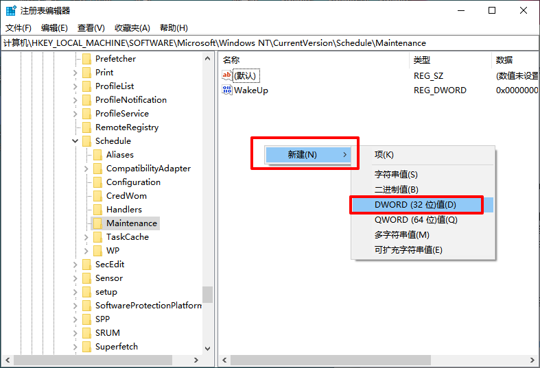 3、在右側(cè)新建DWORD(32位)值,命名為MaintenanceDisabled