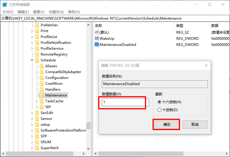 4、雙擊新建值MaintenanceDisabled,將其數(shù)值數(shù)據(jù)修改為1,保存并重啟電腦關(guān)閉自動維護功能