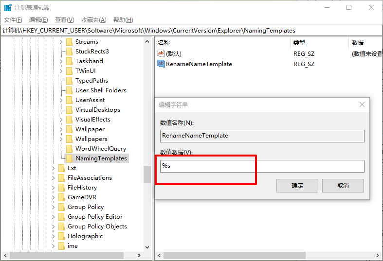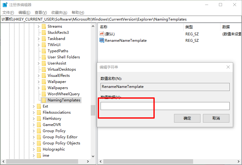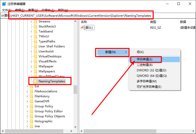 4、選中新建的NamingTemplates項(xiàng)后,在右側(cè)窗口中新建一個(gè)名為RenameNameTemplate的字符串值