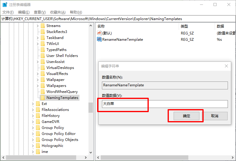 7、如果你把RenameNameTemplate的數(shù)值數(shù)據(jù)設(shè)置為其它的,例如“大白菜”,那么再新建項(xiàng)目時(shí),所有的新建項(xiàng)目的名稱都是“大白菜”了。