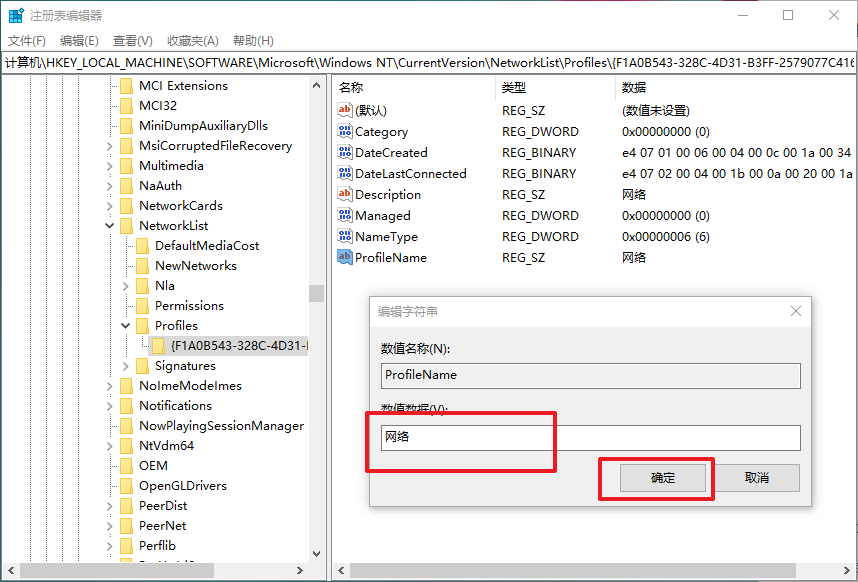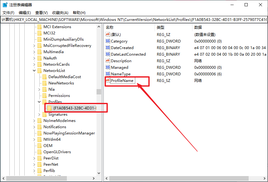 5、 選中需要修改的子項(xiàng)后,在右側(cè)會出現(xiàn)一系列注冊表鍵值,其中ProfileName就是網(wǎng)絡(luò)名稱,雙擊打開并輸入你想修改的名字,點(diǎn)擊“確定”即可