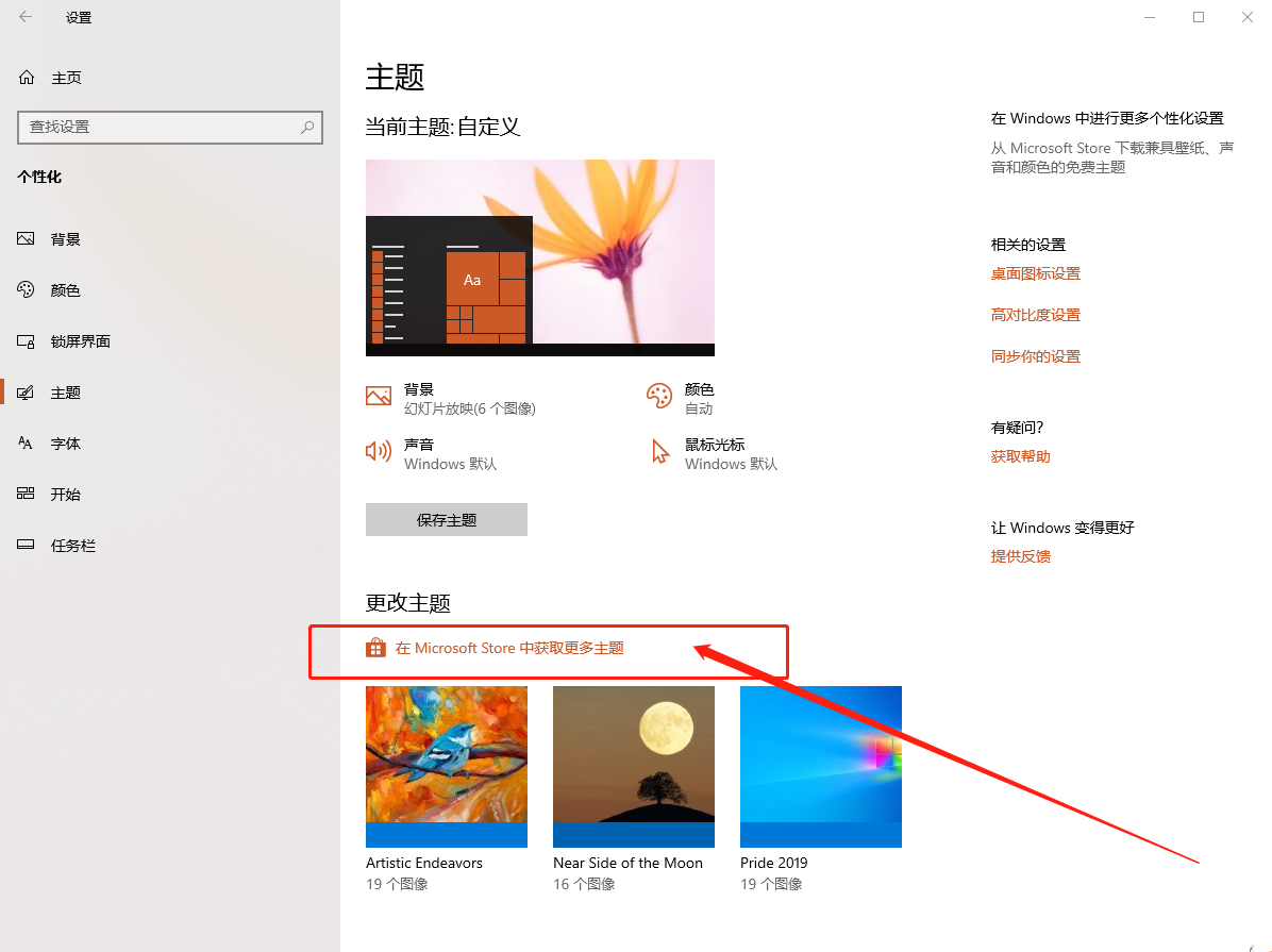 3、隨后,即可在右側(cè)看到應(yīng)用主題,點(diǎn)擊下面的【從應(yīng)用商店中獲取更多主題】;