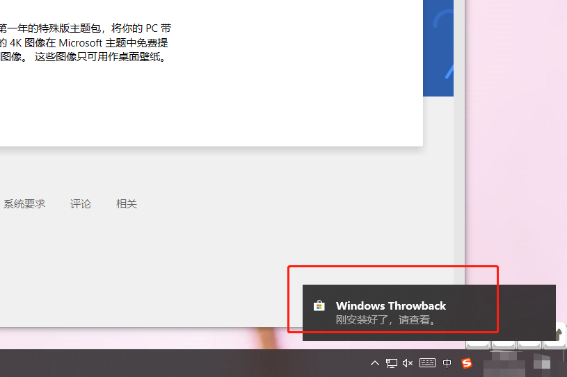 6、系統(tǒng)獲取成功后,你可以在右下角任務(wù)欄上方就可以看到主題安裝好的提示;