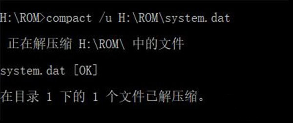 10、接下來說一下解壓文件或者文件夾的步驟,假設(shè),我們要解壓已經(jīng)經(jīng)過壓縮的H:\ROM\system.dat文件,則可以使用以下命令【compact /u H:\ROM\system.dat】,解壓完成后,可以看到如圖的提示。