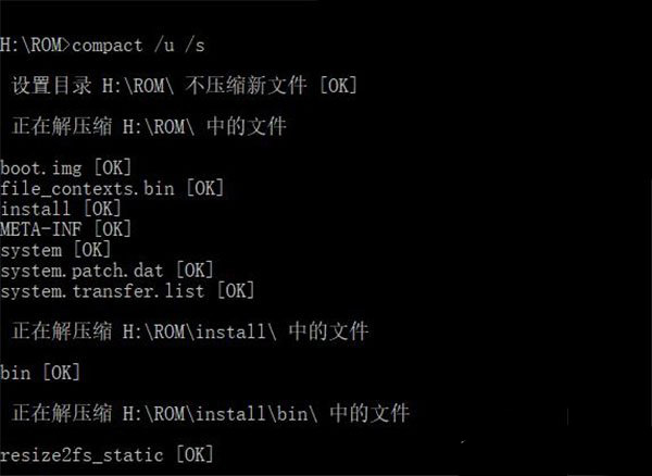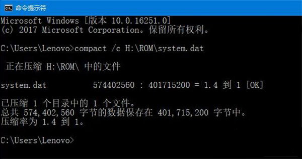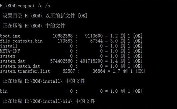 4、回到命令提示符(CMD)頁面,輸入【compact /c H:\ROM\system.dat】并回車執(zhí)行命令,壓縮完成后,你將看到如下圖的提示。