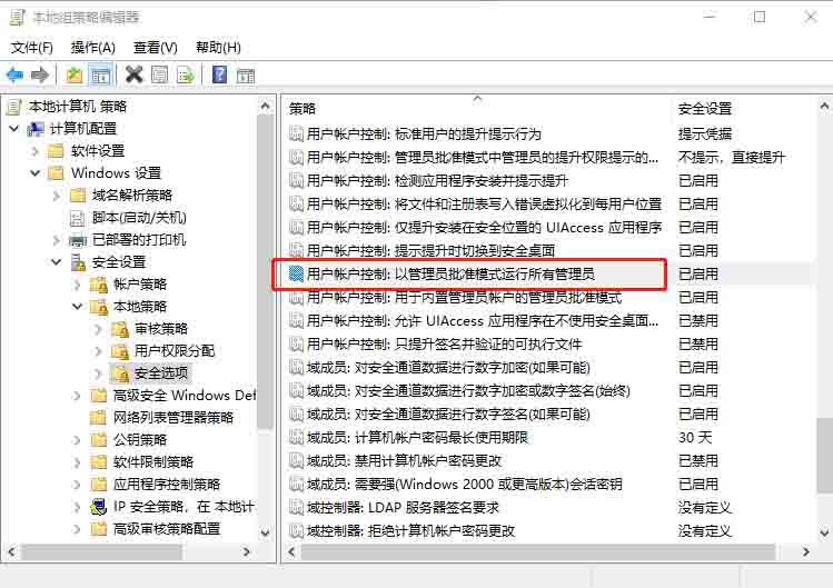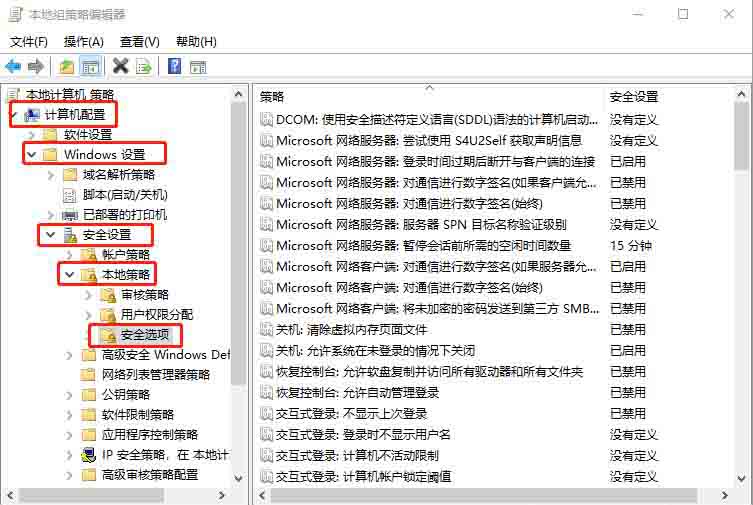 2、在組策略左側(cè),依次展開【計(jì)算機(jī)配置→Windows設(shè)置→安全設(shè)置→本地策略→安全選項(xiàng)】;