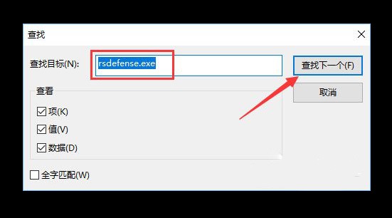 6、在搜索框中搜索【rsdefense.exe】,將搜索結(jié)果中的所有項或值都刪除,最后重啟電腦即可