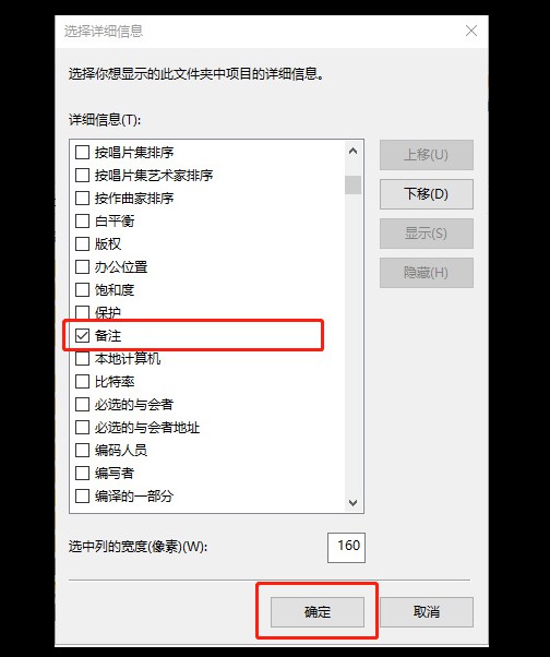 3、在詳細(xì)信息框中找到“備注”并將其勾選起來,點擊“確定”就可以了。