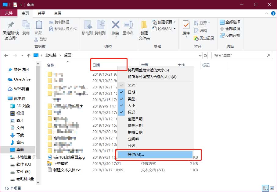 2、在“名稱”、“日期”、“類型”、“大小”或“標(biāo)記”任意一欄上單擊鼠標(biāo)右鍵,選擇“其他”;