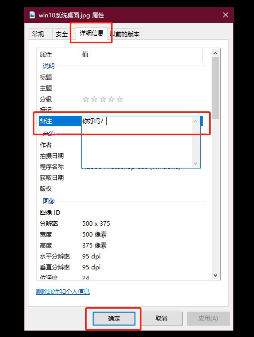 2、在照片屬性界面點擊“詳細(xì)信息”選項卡,找到“備注”一欄,點擊“備注”后面空白的“值”,就可以輸入需要備注的文字,輸入完成后點擊確定即可。