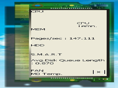 硬件監(jiān)視程序顯示于桌面的硬件信息監(jiān)視程序,包含cpu使用率、cpu溫度、內(nèi)存容量使用情況、pages/sec 計數(shù)器
