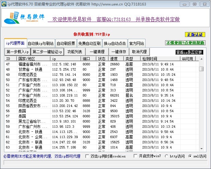 優(yōu)易ip代理軟件功能介紹: 1.最新代理每日上萬(wàn)ip數(shù)據(jù)自動(dòng)同步! 2.簡(jiǎn)單點(diǎn)擊立即生效 3.免費(fèi)綠色即下即用 4.