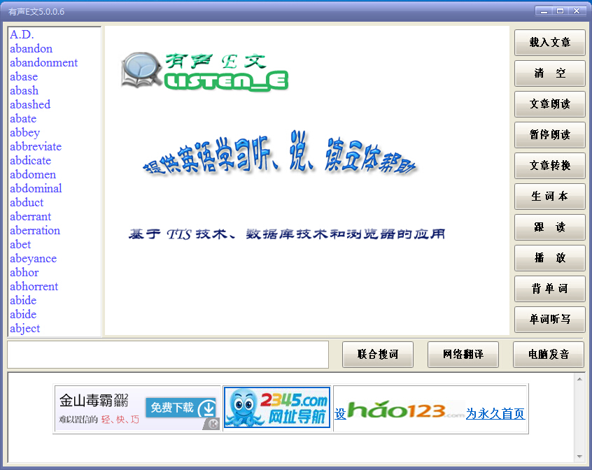 有聲E文是一款功能強(qiáng)大的英語(yǔ)學(xué)習(xí)軟件。通過(guò)驅(qū)動(dòng)文本語(yǔ)言轉(zhuǎn)換、數(shù)據(jù)庫(kù)技術(shù)和web瀏覽器應(yīng)用三項(xiàng)技術(shù)合一制作