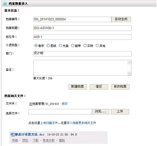 多可檔案管理系統(tǒng)是基于文檔管理系統(tǒng)之上的升級擴充產(chǎn)品,包含文檔管理系統(tǒng)全部功能。此外增加實物檔案的錄