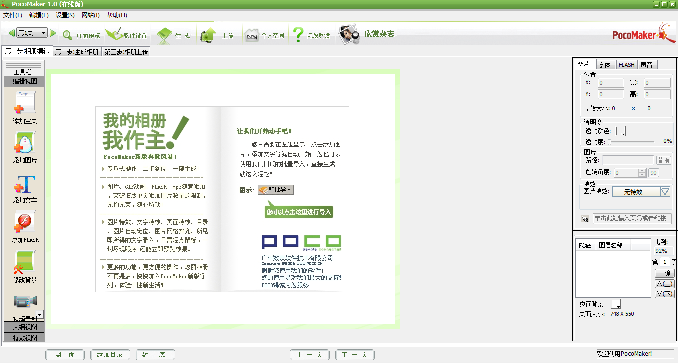 PocoMaker(魅客)是一款完全免費(fèi)的電子雜志制作工具。他可以制作電子相冊(cè)、電子雜志、電子讀物等多種個(gè)性