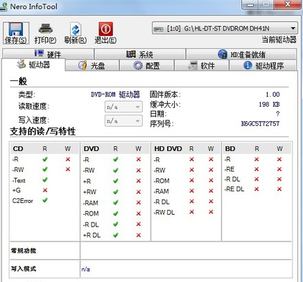 Nero InfoTool是一款綠色軟件,解壓起動后在“Drive”選項卡里面就可以看到刻錄機的基本參數(shù),包括我們關心