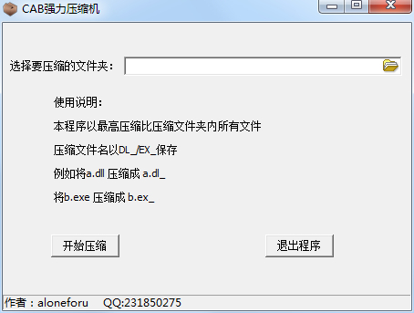 CAB強(qiáng)力壓縮工具。本程序以最高壓縮比壓縮文件夾內(nèi)所有文件,壓縮文件名以DL_/EX_保存。例如將a.dll 壓縮成