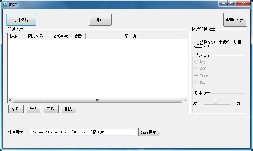 一款批量圖片(圖像)轉換器。支持Bmp、Gif、Jpeg、Png等格式,具有文件反選、質(zhì)量設置等功能。使用提示: