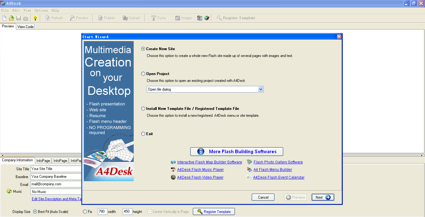 A4Desk 是一款專業(yè)的、以Flash 模板為基礎(chǔ),幫助用戶創(chuàng)建Flash 菜單和Flash 網(wǎng)站的Flash 設(shè)計、制作軟件,