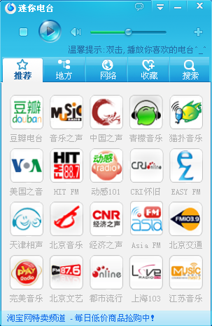 迷你電臺是一款體積小巧的網(wǎng)絡(luò)電臺,占用系統(tǒng)資源極低,可最小化到系統(tǒng)托盤中?;诰W(wǎng)絡(luò)音樂電臺、中國網(wǎng)絡(luò)