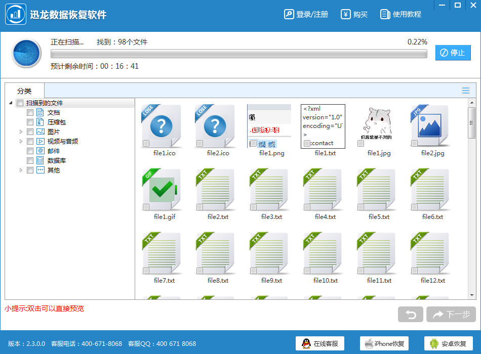 迅龍數(shù)據(jù)恢復(fù)軟件針對(duì)于各類照片、圖片、word文檔、txt文檔、壓縮包、常見音頻、視頻文件,幾乎所有的文件
