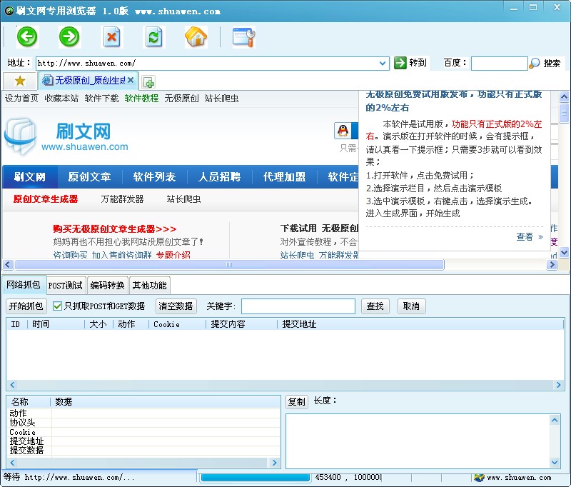專門為國人設(shè)計(jì)的抓包瀏覽器,主要作用是輔助新手程序員快速的進(jìn)行編程輔助。采用全中文模式,一鍵測試操作