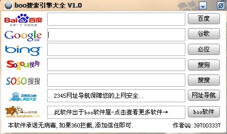boo搜索引擎大全是由boo軟件屋原創(chuàng)打造的一款集合了國內(nèi)5大搜索引擎,軟件界面清新,無閑雜廣告。 特色是: